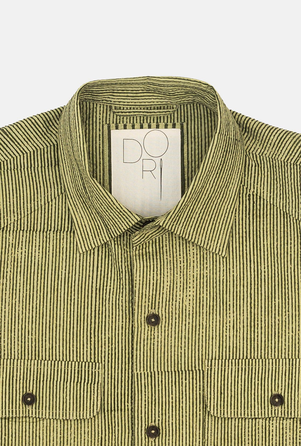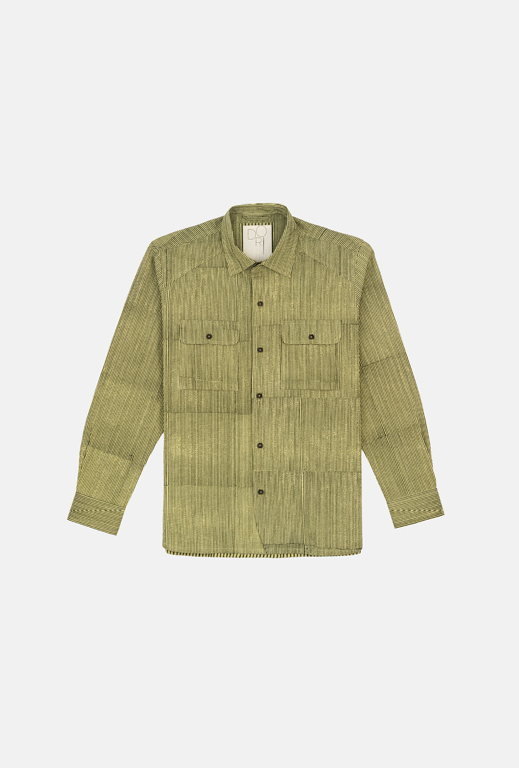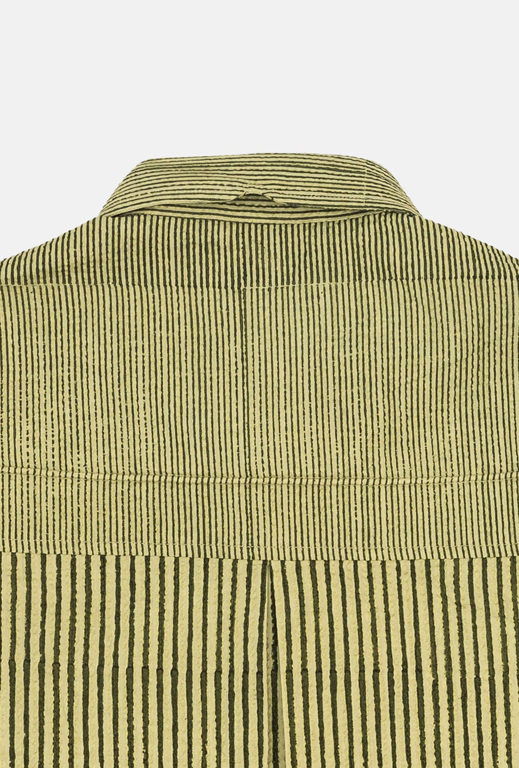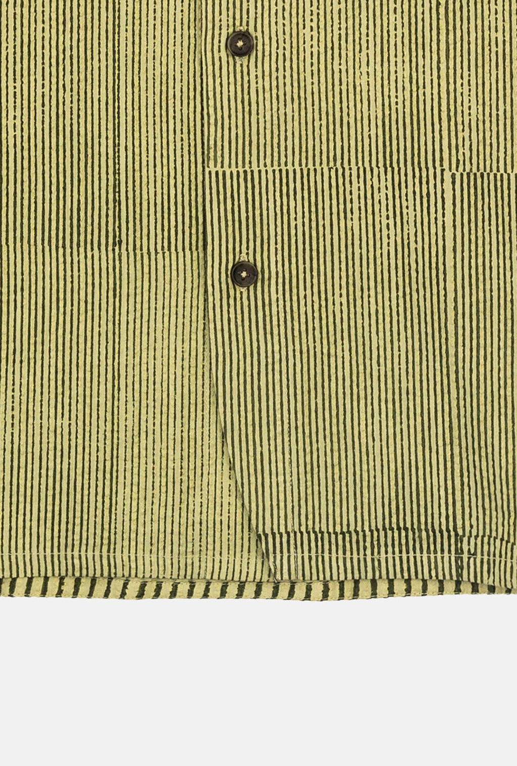 Celebrating craftsmanship and cultural heritage, the Gridline Shirt showcases tonal pinstripes of differing widths, achieved through careful block printing on lightweight seersucker material. Featuring a distinctive Dori placket, buttons with a marble-like finish, patch pockets, and a curved hem with gussets, it elegantly pays homage to tradition while being reinterpreted for modern fashion.