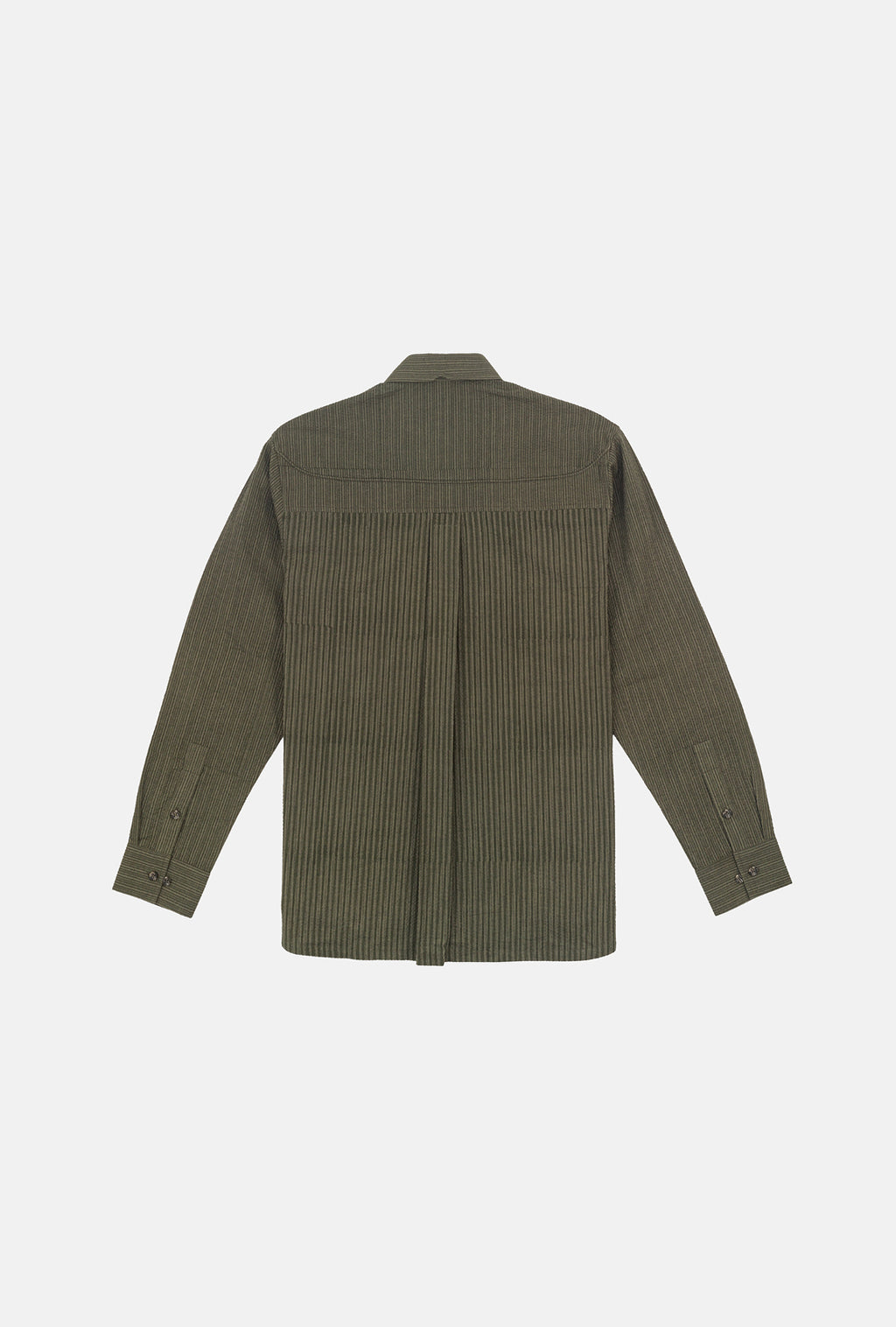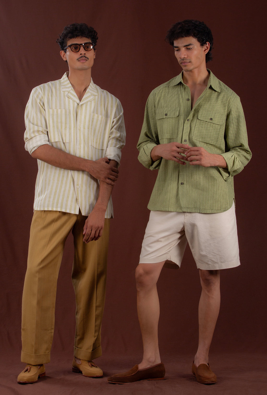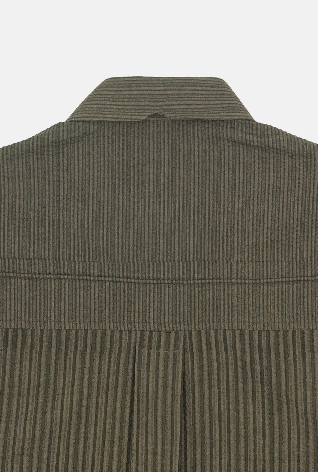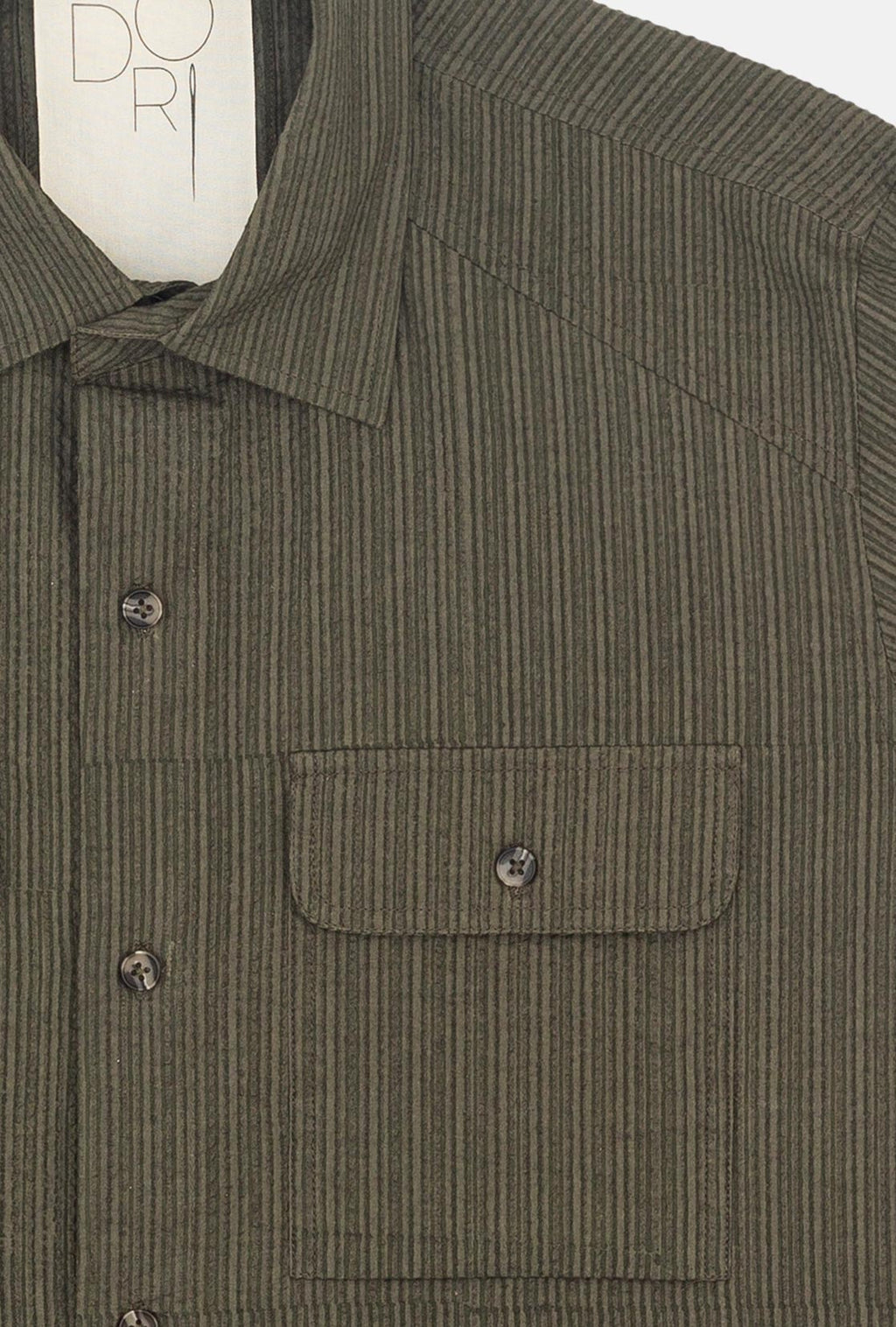 Celebrating craftsmanship and cultural heritage, the Gridline Shirt showcases tonal pinstripes of differing widths, achieved through careful block printing on lightweight seersucker material. Featuring a distinctive Dori placket, buttons with a marble-like finish, patch pockets, and a curved hem with gussets, it elegantly pays homage to tradition while being reinterpreted for modern fashion.