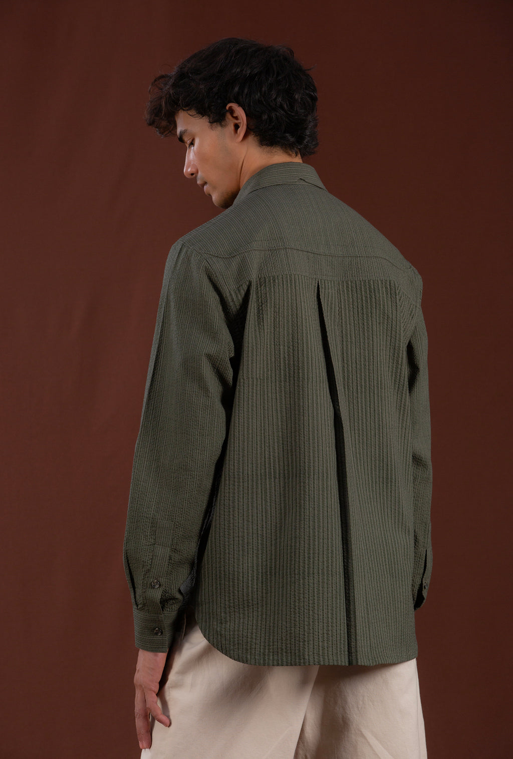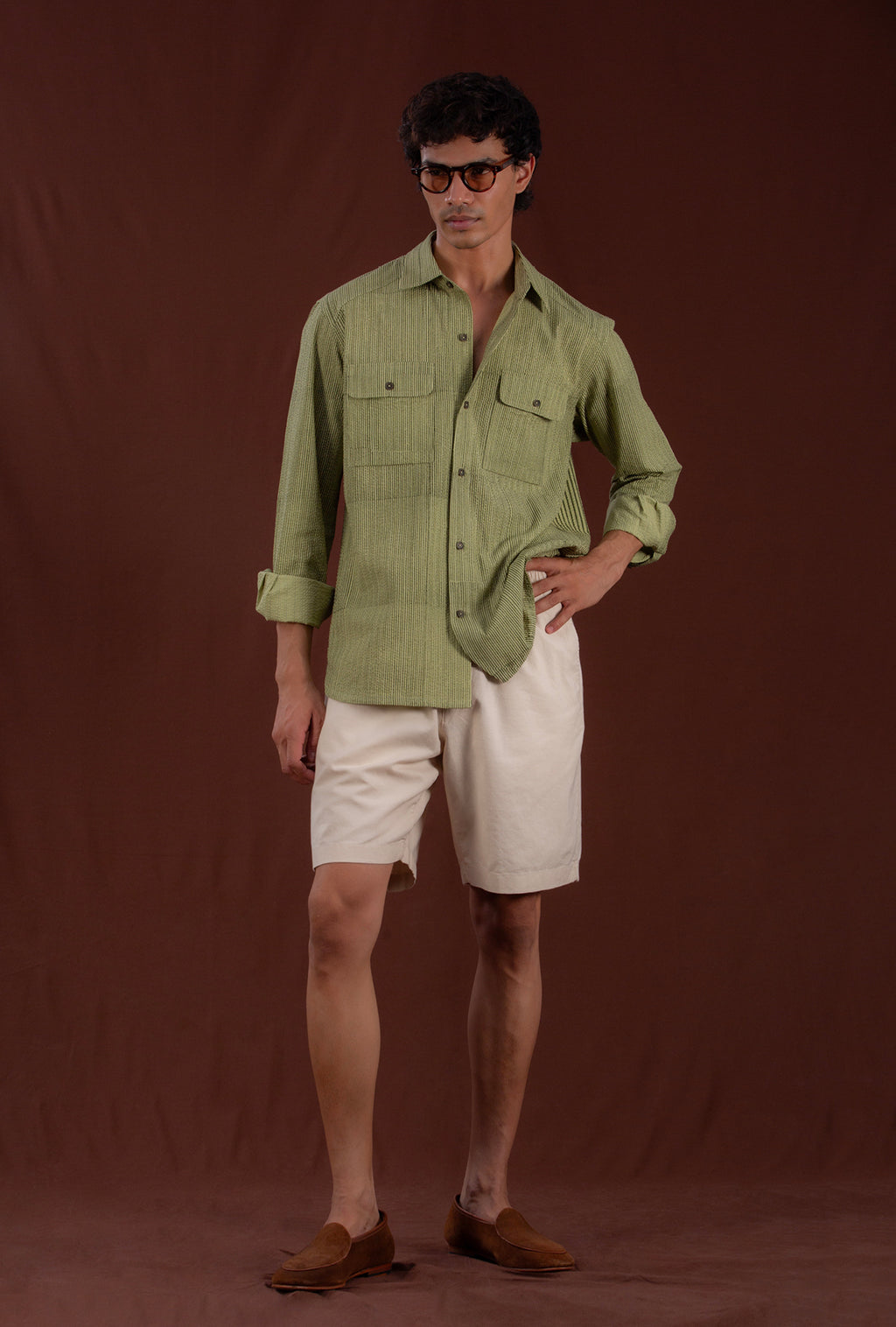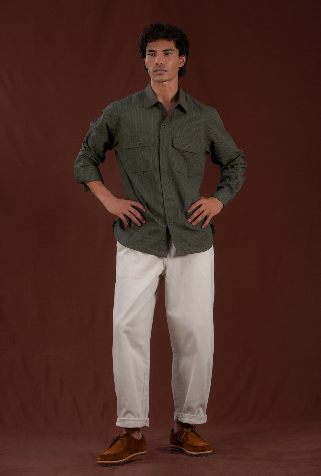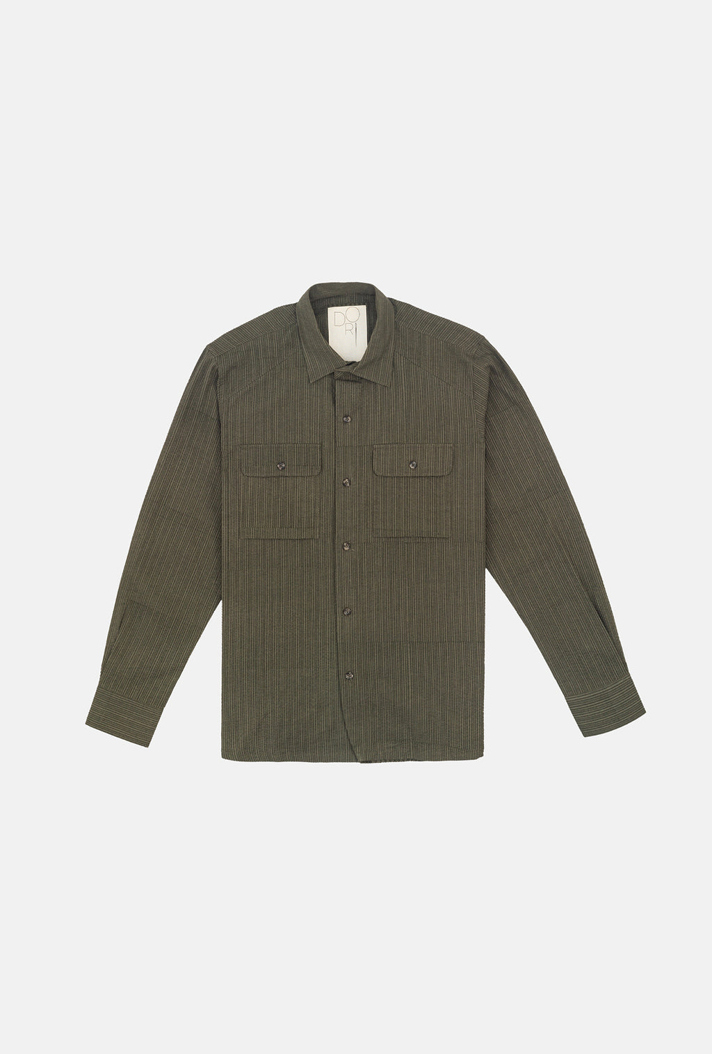 Celebrating craftsmanship and cultural heritage, the Gridline Shirt showcases tonal pinstripes of differing widths, achieved through careful block printing on lightweight seersucker material. Featuring a distinctive Dori placket, buttons with a marble-like finish, patch pockets, and a curved hem with gussets, it elegantly pays homage to tradition while being reinterpreted for modern fashion.