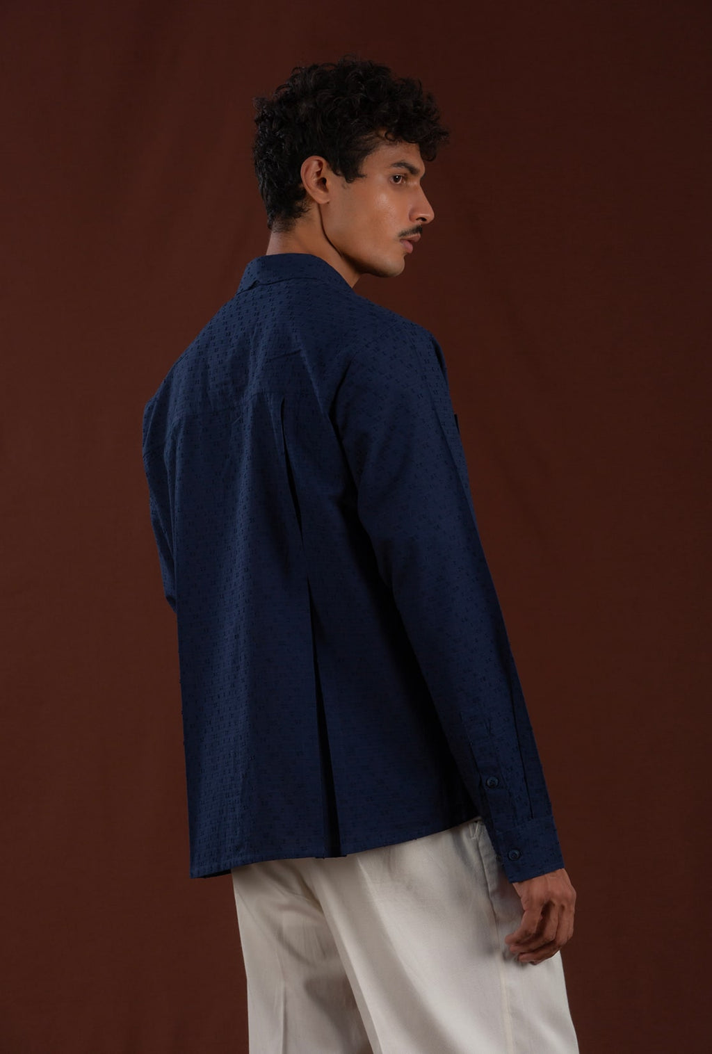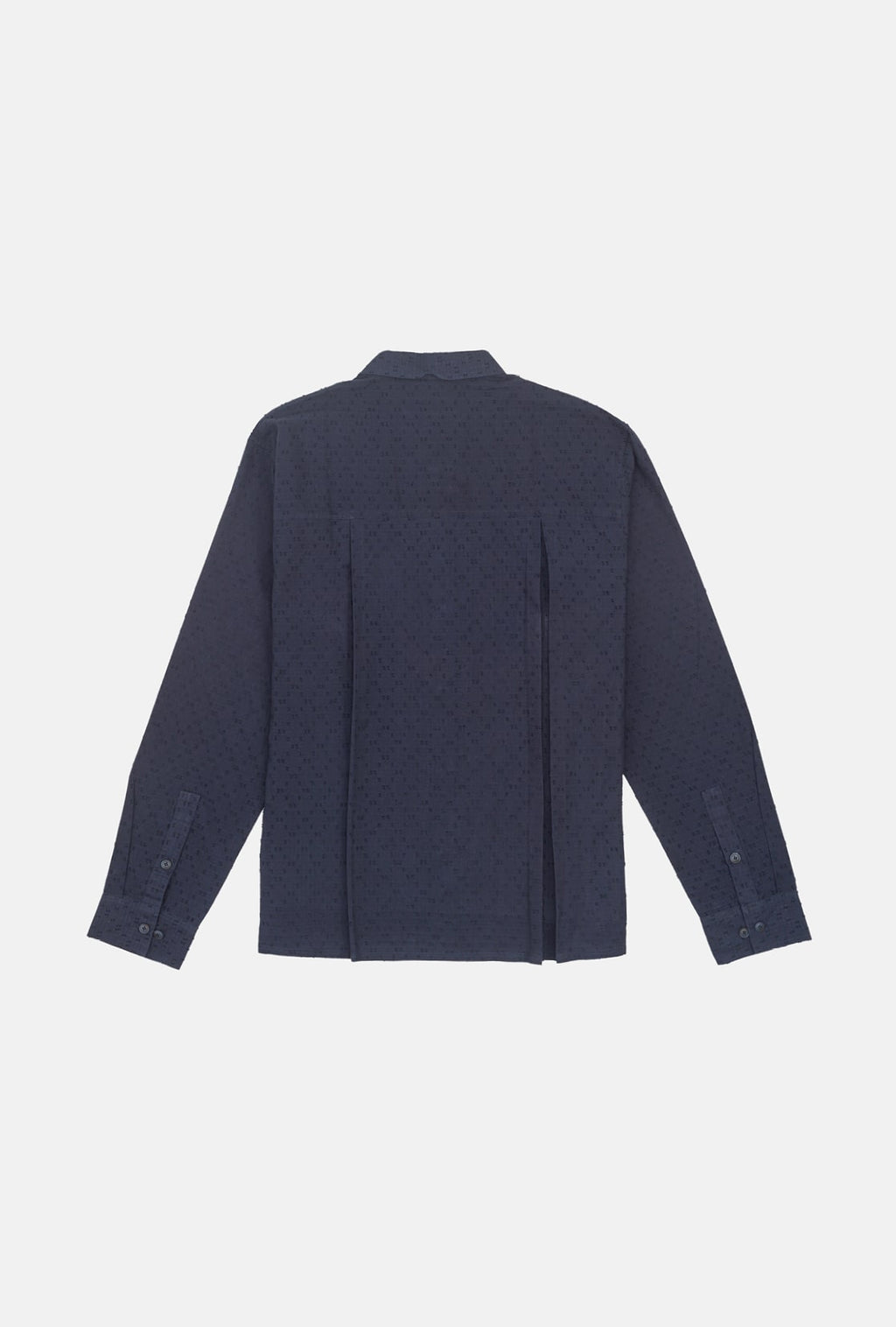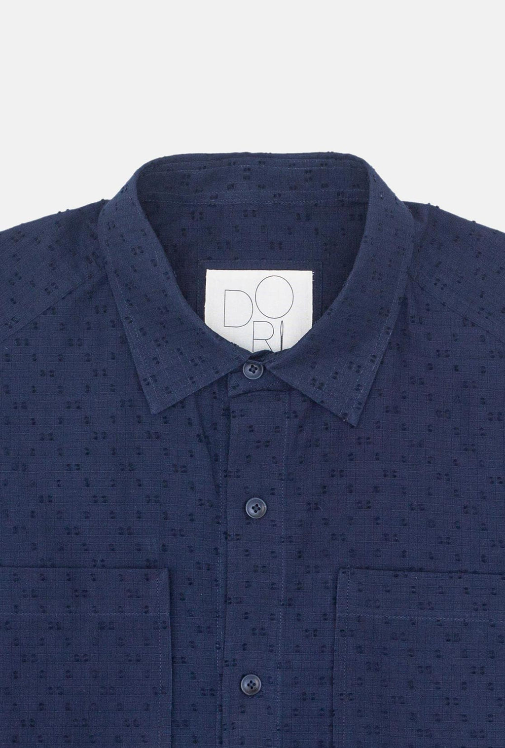 Celebrating the beauty of tactile geometry, the Moire Shirt is crafted from extra weft material, showcasing a delicate criss-cross pattern. The distinctive Dori placket serves as the foundation of the design, enhanced by a comfortable fit and a tailored hem. This shirt boasts two types of pleats, a knife and a box, at the rear, along with front patch pockets and marble-inspired buttons for a touch of functional sophistication.