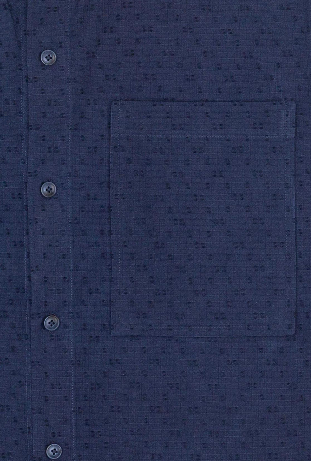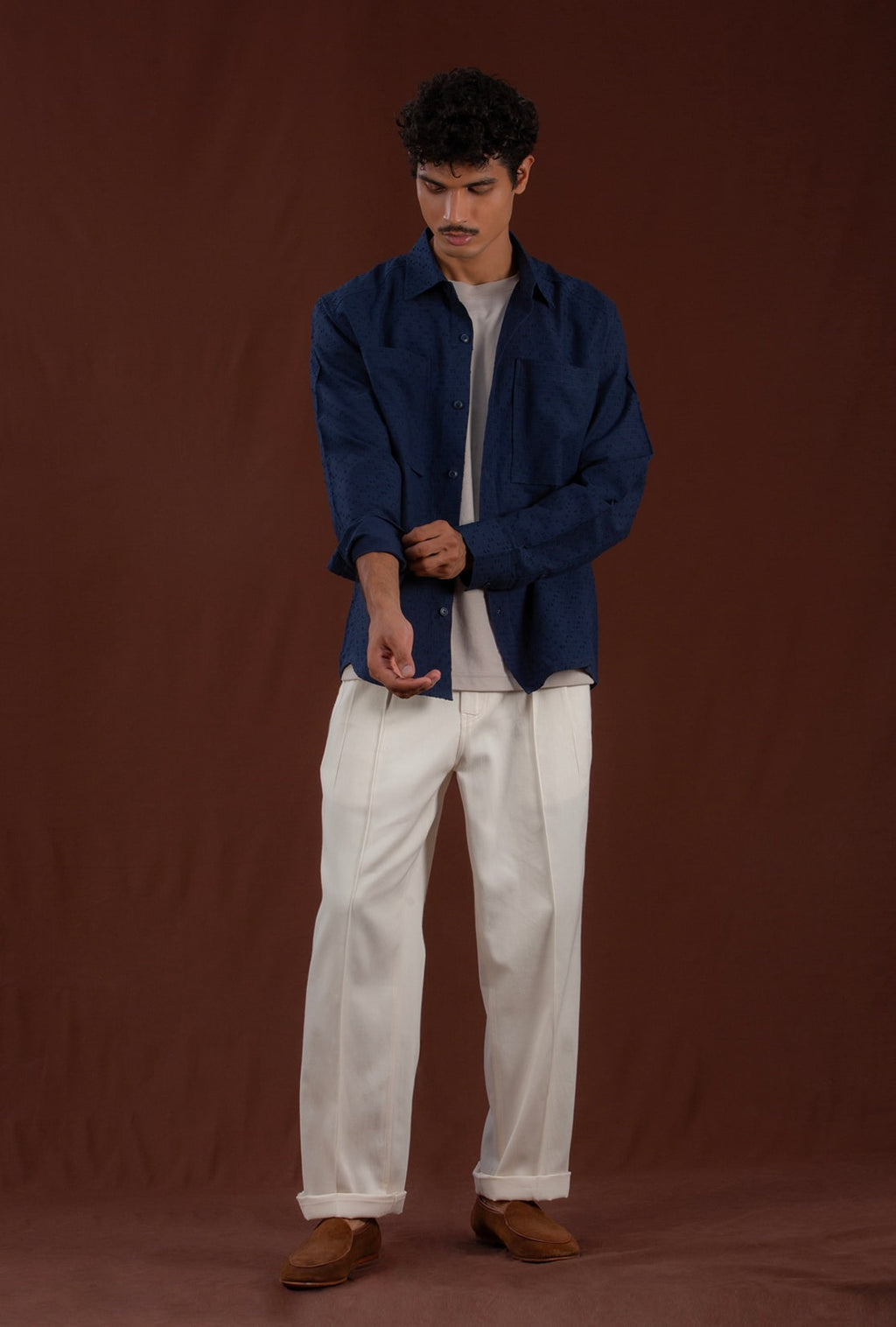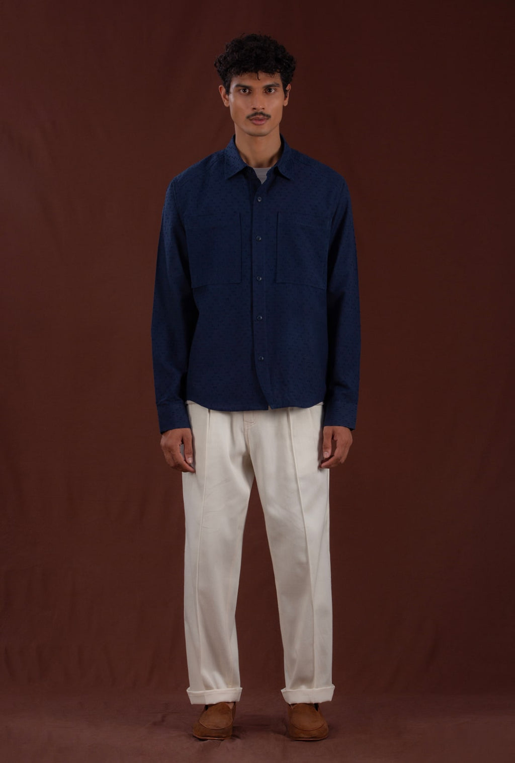 Celebrating the beauty of tactile geometry, the Moire Shirt is crafted from extra weft material, showcasing a delicate criss-cross pattern. The distinctive Dori placket serves as the foundation of the design, enhanced by a comfortable fit and a tailored hem. This shirt boasts two types of pleats, a knife and a box, at the rear, along with front patch pockets and marble-inspired buttons for a touch of functional sophistication.