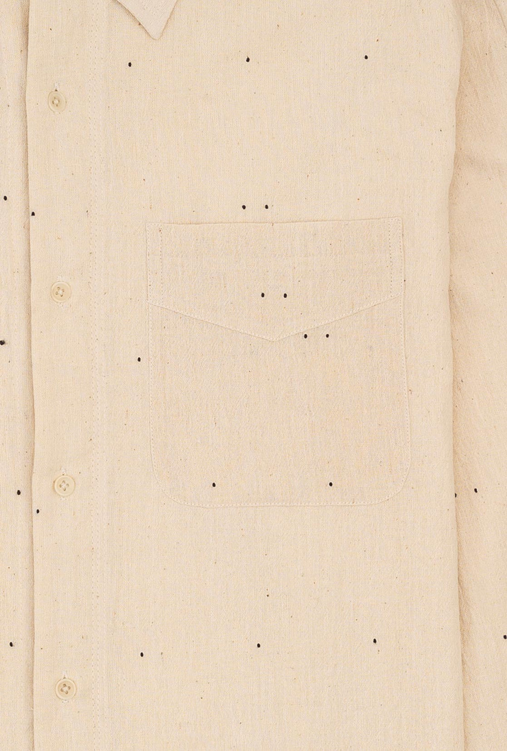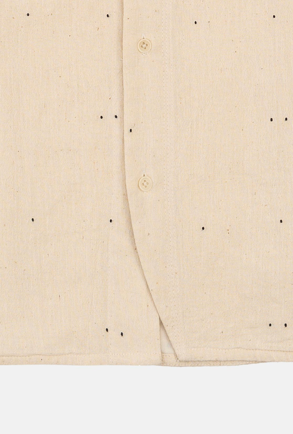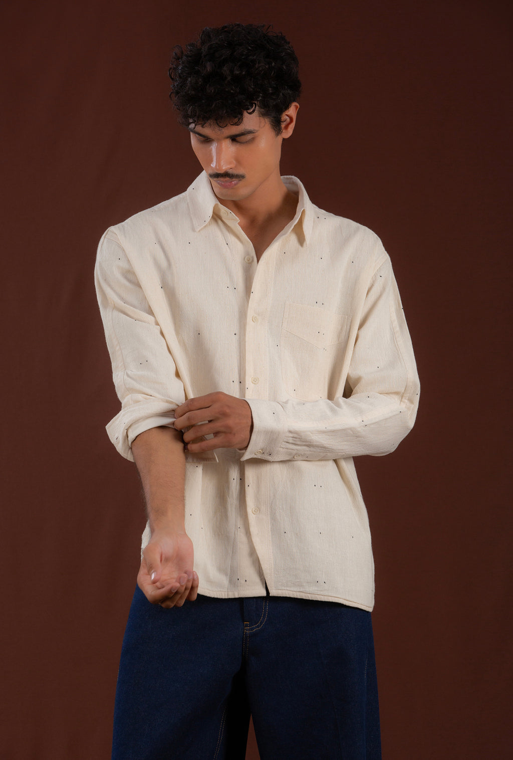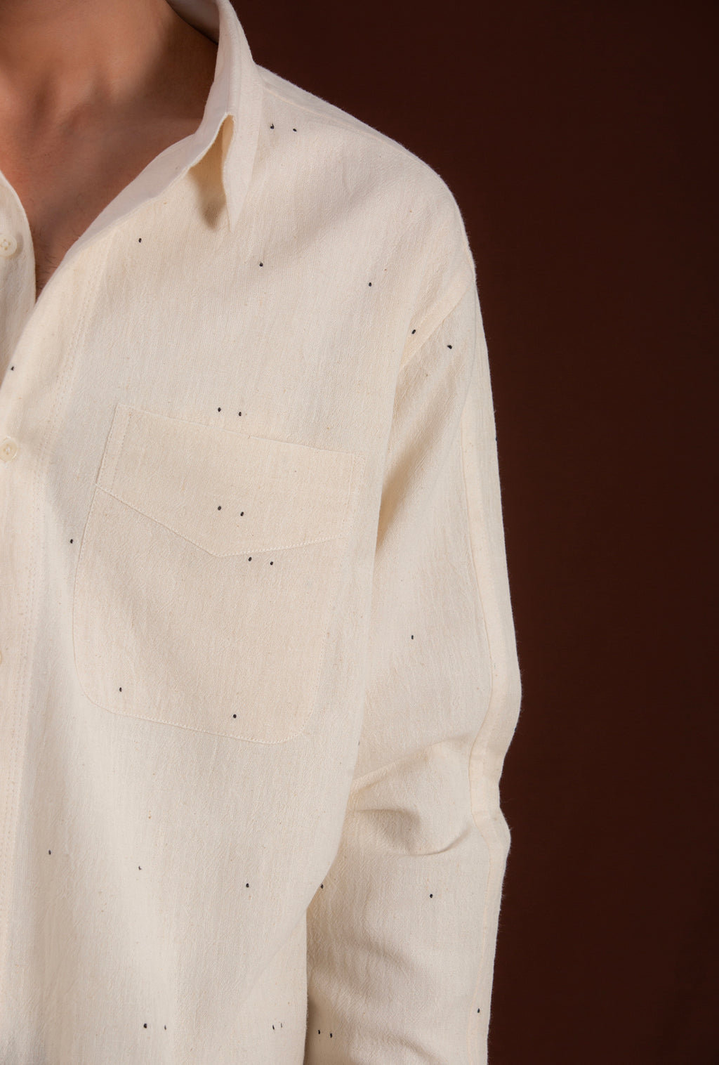 Craftsmanship at its finest, the Ridge Shirt is meticulously handwoven in Kutch from Kala cotton, featuring precisely dotted bead-like accents typical of Tangaliya. With its distinctive Dori placket, curved hem, and thoughtfully designed sleeve cut, this piece embodies understated elegance. The Ridge Shirt transforms traditional dotted designs into modern silhouettes, drawing inspiration from the subtlety of photographic geometry.